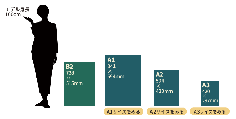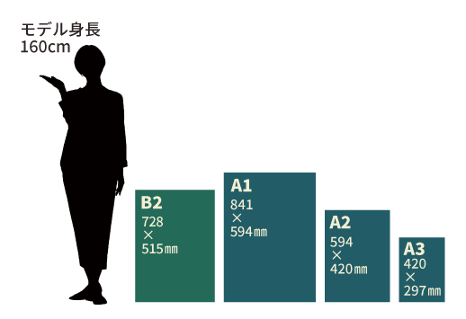 B2サイズは「515mm×728mm」です。B1サイズを半分に折った大きさで、人間の頭から腰のあたりまでが隠れるサイズです。身近にあるB2サイズのものには、カレンダーやポスター、道路に置かれるカラーコーン(三角コーン)などがあります。