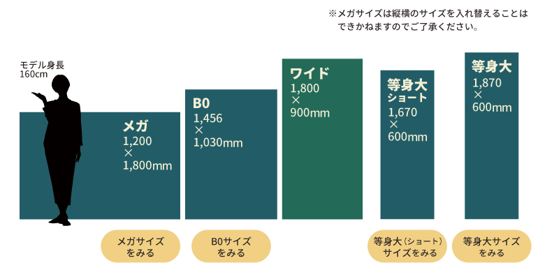ワイドタペストリーのサイズは「1,800mm×900mm」です。タペストリーキングで取り扱う中で最も高さのあるタペストリーで、自動販売機と同じくらいの高さがあります。その縦に長い形状から、店舗の看板として幕のように吊り下げて使ったり、案内板として高い場所から掲げたりするのに向いています。B0よりも高さのあるサイズであり、高い場所から飾る場合に特に適しているといえます。