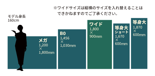 ワイドタペストリーのサイズは「1,800mm×900mm」です。ワイドサイズはインパクトを与えやすい大きさで、お店の看板・案内板や、イベントの装飾、部屋に飾るインテリアなど、様々な場面でお使いいただけます。